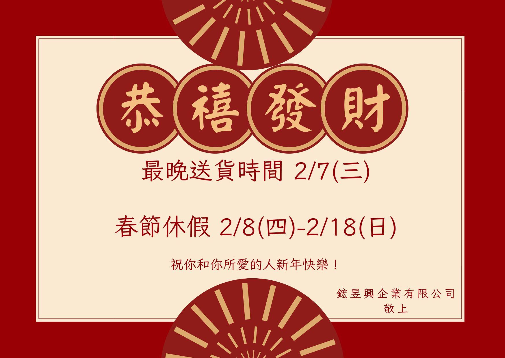 2024 HAPPY CHINESE NEW YEAR 親愛的客戶與夥伴: 2024年 過年休息公告請注意 2/7 最後送貨時間 2/8-2/18 春節休假 2/19 正式上班 請客戶與夥伴們,有任何疑問於2/19正式上班時間再來電。 祝各位 新年快樂, 鋐昱興全體員工敬賀